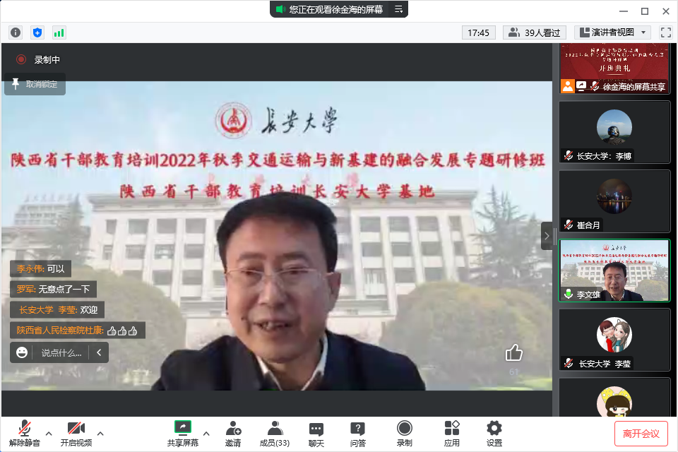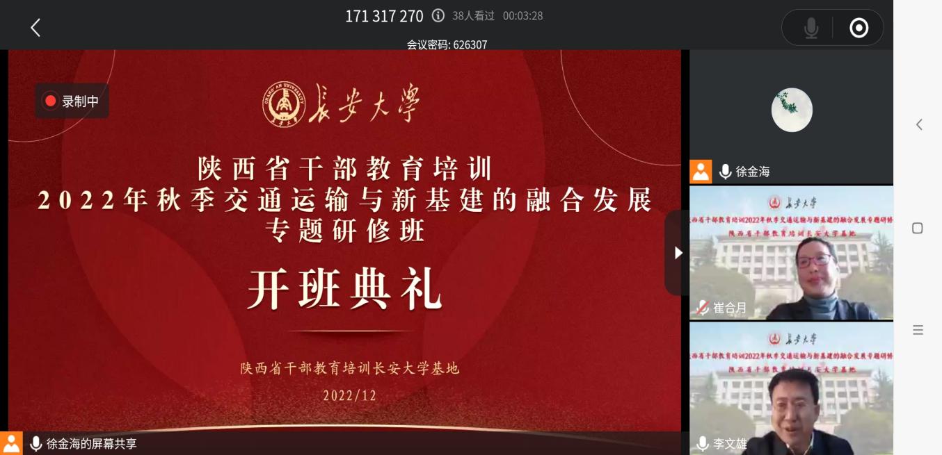 12月19日上午,由陕西省委组织部主办、陕西省干部教育培训万象城allwincity官网基地承办的2022年秋季“交通运输与新基建的融合发展”专题研修班在线上顺利开班。研修班举办线上开班仪式,万象城allwincity官网党委常委、组织部部长李文雄出席开班仪式并致辞,来自省市区(县)有关部门、企业的36名领导干部及万象城allwincity官网相关老师参加了仪式。
